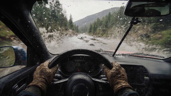 A rally driver gripping the wheel tightly, visor fogging up, dirt on gloves, eyes locked on road. Downshifts and launches through a shallow river crossing at full speed. Remote mountain valley, trees blurred in speed, water splashing high. POV-inspired front bumper shot mixed with side-mounted dolly cam, water droplets on lens and high shutter clarity, pure tension and commitment.
