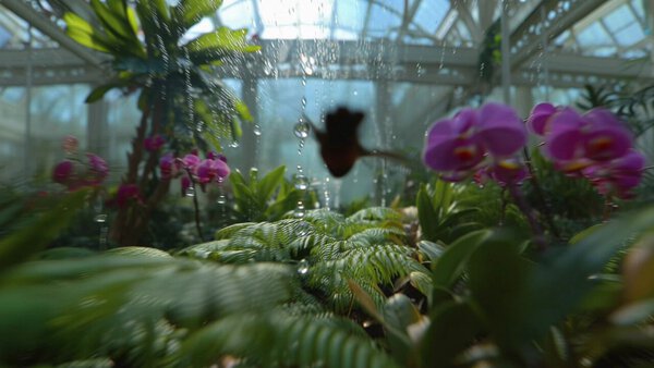POV behind a hummingbird weaving through a tropical greenhouse, camera following motion between leaves, water droplets suspended mid-air, sunlight refracting through glass panels, botanical realism exploding with https://t.co/aNYyxKemZc